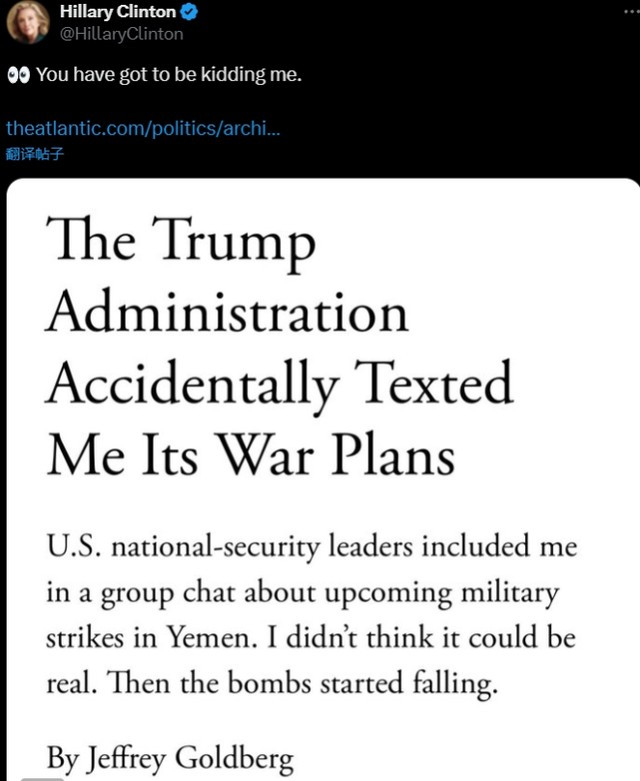 面对这一严重失误,白宫国家安全委员会发言人布赖恩·休斯表示,记者杰弗里被拉进政要群聊的事情目前“正在审查”。
